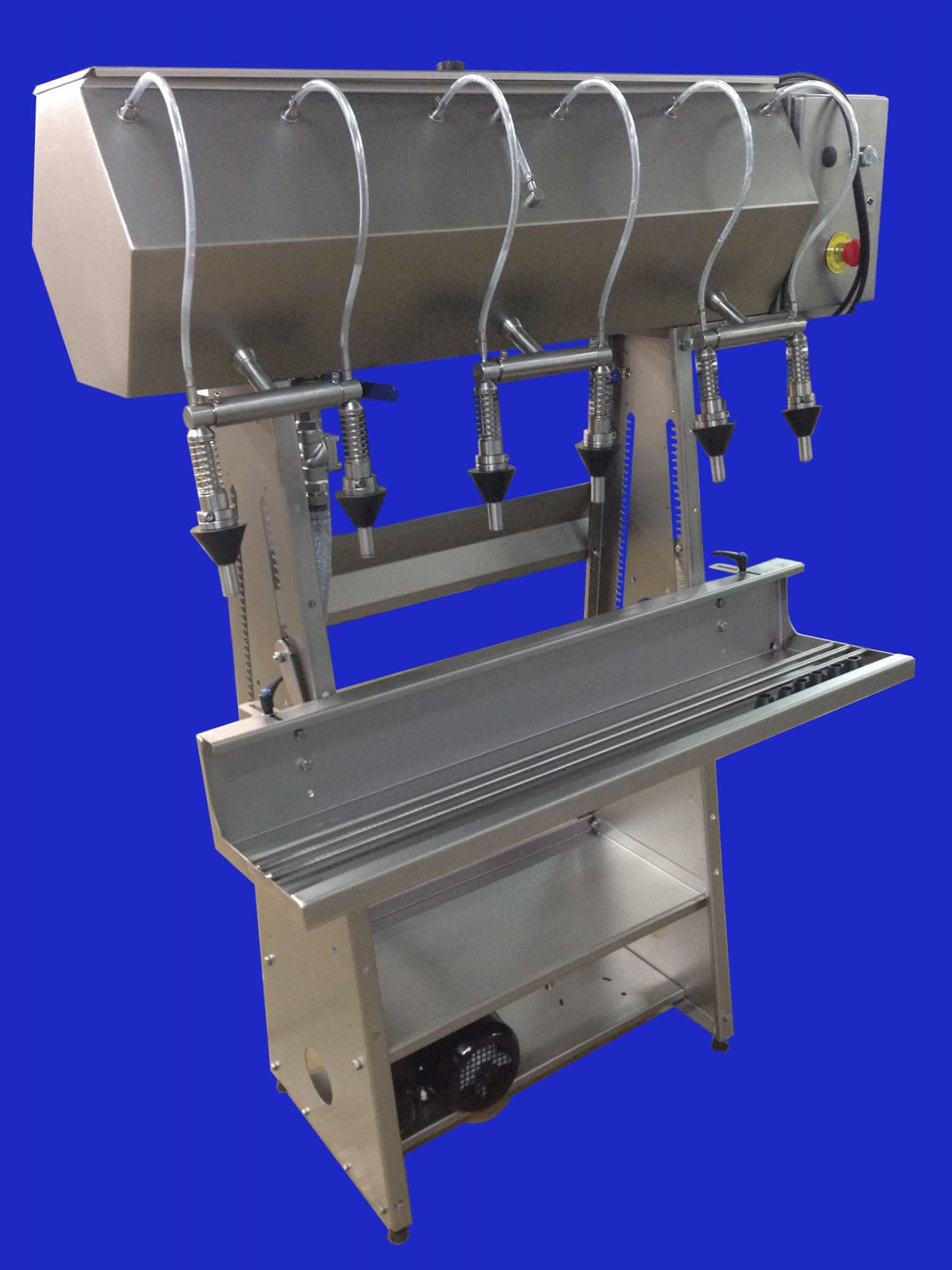 Máquina llenadora por gravedad de botellas y garrafas. Cuenta con 6 boquillas articuladas para favorecer la introducción y extracción de las botellas. Está equipada con bomba y control de nivel para el llenado del depósito superior